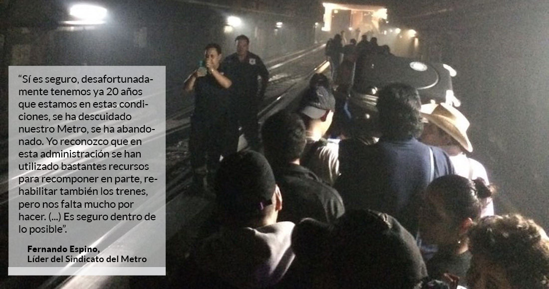 "Sí es seguro, desafortunadamente tenemos ya 20 años que estamos en estas condiciones. Se ha descuidado nuestro Metro, se ha abandonado. Yo reconozco que en esta administración se han utilizado bastantes recursos para recomponer en parte el sistema, rehabilitar también los trenes, pero nos falta mucho por hacer. (...) Es seguro dentro de lo posible", admitió el líder sindical.
