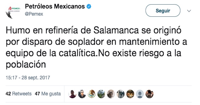 En la cuenta de Twitter de Pemex se publicó que la nube de aspecto amarillento "se originó por disparo de soplador en mantenimiento a equipo de la catalítica." Aseverando que esto no representa un riesgo para la población.