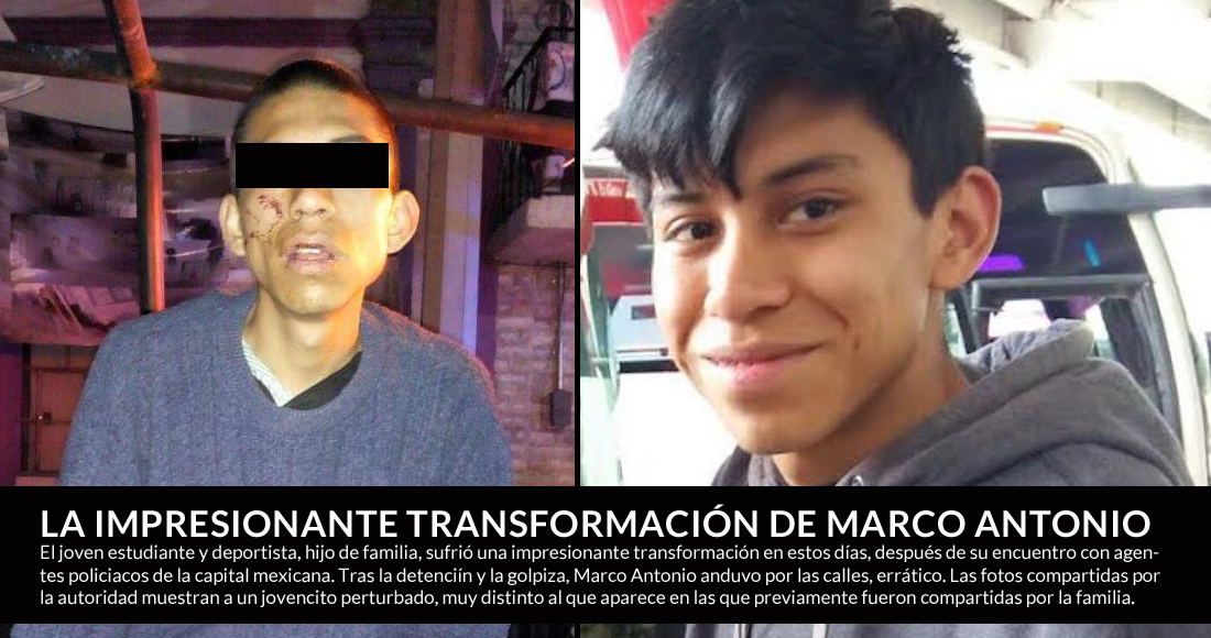Ayer por la noche fueron compartidas fotos del menor de edad. El estudiante, un deportista que tomaba clases de artes marciales, un hijo de familia, sufrió una impresionante transformación en estos días, después de su encuentro con agentes policiacos de la capital mexicana. Tras la detención y la golpiza, Marco Antonio anduvo por las calles, errático. Las fotos compartidas por la autoridad muestran a un jovencito perturbado, muy distinto al que aparece en las que previamente fueron compartidas por la familia.