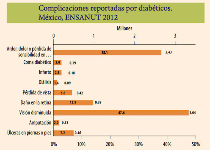 El caso de esta mujer de 62 años es muy común en el país. El síndrome de pie diabético conlleva a uno de cada 40 diabéticos a una amputación. Hasta 2012, había 6.4 millones de mexicanos con diabetes, de los cuales 13.9 por ciento presentaba ardor, dolor o pérdida de sensibilidad en los pies, y entre dos y tres por ciento alguna amputación por una úlcera que no se pudo controlar, de acuerdo con la Encuesta Nacional de Salud y Nutrición (Ensanut).