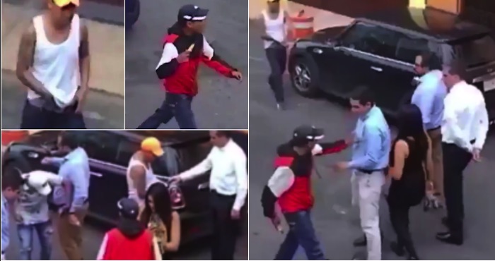 En el video se observa cómo uno de los supuestos asaltantes, quien es el que los intercepta en primer lugar, saca una navaja, mientras que su complice amaga con sacar un arma de fuego de su pantalón.