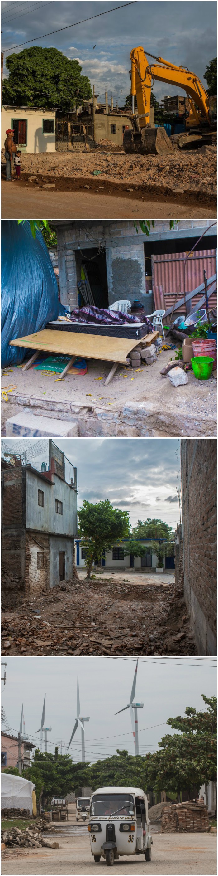 En Juchitán, Oaxaca, los pobladores viven entre las ruinas de sus propios hogares. A diferencia de la rapidez con la que se actuó en la Ciudad de México para retirar las construcciones que tiró el sismo de 7.1 del pasado 19 de septiembre, en la zona del Istmo todavía no concluyen las labores de limpieza de escombros, realizadas principalmente por los mismos habitantes.