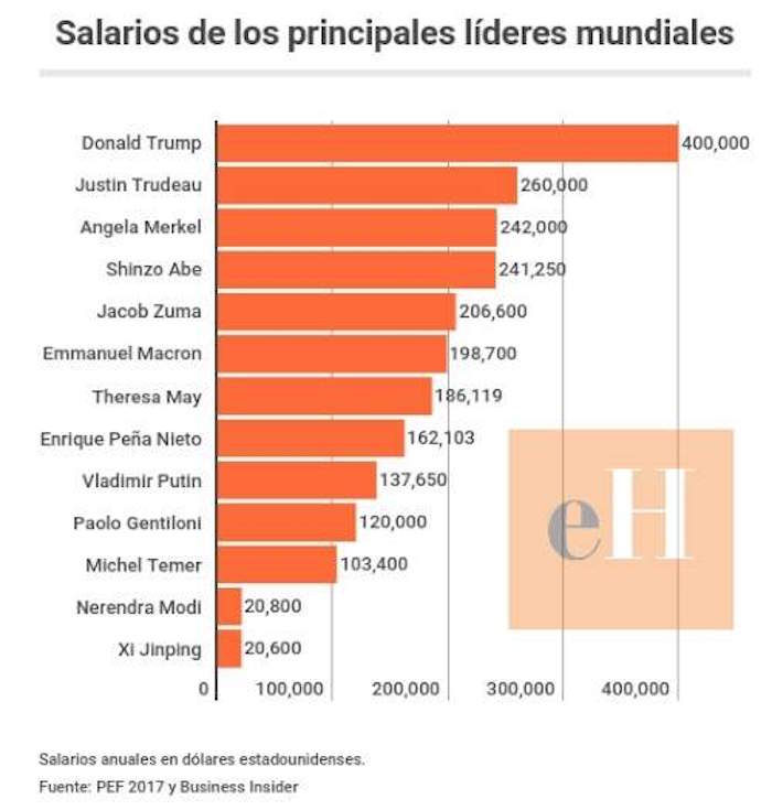 En tanto, el ya multimillonario Donald Trump tiene el mayor salario de todos, con 400 mil 000 dólares anuales, cantidad que prometió donar a la caridad.