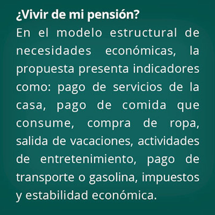 La propuesta presenta diversos indicadores o variables, a partir de dimensiones trascendentes en la vida de los adultos mayores como son: bienestar general (cuenta con 14 indicadores), necesidades económicas (ocho indicadores), redes de apoyo (seis variables), trabajo y ambiente (cuatro indicadores), autonomía (siete indicadores), bienestar intrasubjetivo (cinco variables) y autodeterminación y plan de vida (15 indicadores).