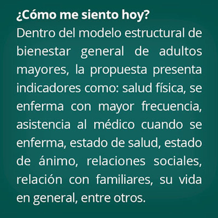 “Nos olvidamos por un momento de la patología y nos enfocamos en saber cómo enfrenta la vida cotidiana, cómo se apoya para enfrentar todos los aspectos de su cotidianidad y hasta qué punto el adulto mayor tiene control de su vida, que es uno de los aspectos más relevantes y que más valoran: la autonomía y el control que ellos tengan sobre su vida”, indicó el doctor González Tovar.