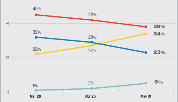 Según estas cifras, el apoyo a Peña bajó 4 puntos respecto a la encuesta publicada por este diario el pasado 25 de abril, López Obrador subió 7 puntos, Vázquez Mota bajó 6 puntos y Gabriel Quadri sumó 3 puntos.