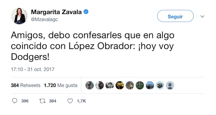 Y este martes, la ahora ex panista Margarita Zavala Gómez del Campo también se sumó al tema y publicó un tuit en donde dijo que si hay algo en lo que coincide con el líder del partido Movimiento Regeneración Nacional es que le va a los Dodgers en la Serie Mundial.