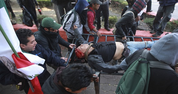20 de noviembre de 2014: Tras una multitudinaria movilización por los 43 normalistas desaparecidos de Ayotzinapa que confluyó en el Zócalo, hubo enfrentamientos entre personas con los rostros cubiertos y policías federales y granaderos. Los policías comenzaron a desalojar el Zócalo, agrediendo a personas ajenas a los actos de violencia, que aún se encontraban en la plancha del Zócalo, y haciendo detenciones que han sido denunciadas como arbitrarias. Por la mañana de ese día, en las inmediaciones del Aeropuerto Internacional de la Ciudad de México también se enfrentaron granaderos de la SSPDF con jóvenes con los rostros cubiertos quienes lanzaron palos, tubos, piedras y bombas molotov a los policías. En total, ese día fueron detenidos 31 personas, pero sólo 11 fueron consignados por delitos graves. El sábado 29 de noviembre, todos ellos fueron liberados por falta de pruebas en su contra.