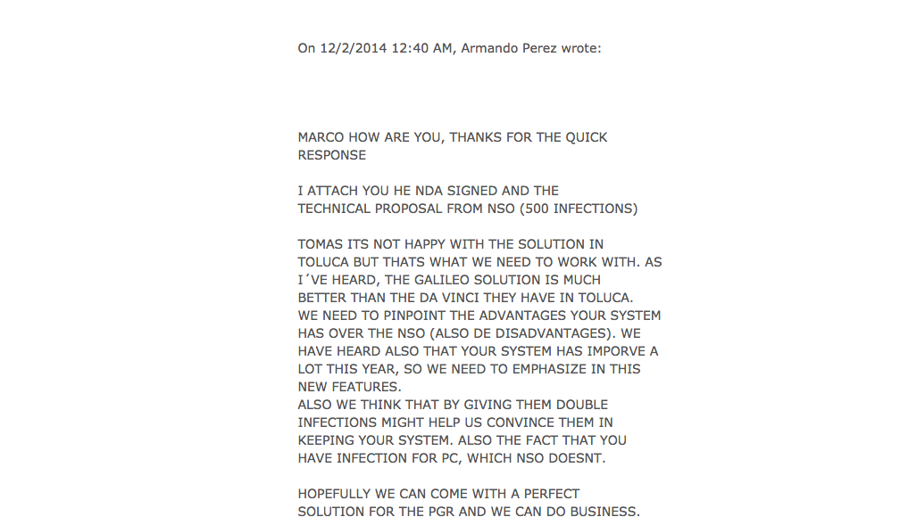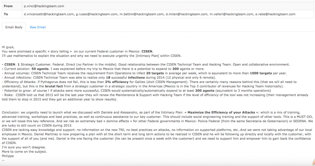 Un mensaje enviado por Sergio Rodríguez-Solís, ingeniero de la firma italiana, quien reportó que en una visita hecha al CISEN el 15 de enero de 2014, consignó: “ellos explicaron que habían probado por sí mismos un sistema de infección ‘manos libres’ para teléfonos móviles que funcionaba en hasta 80 por ciento de los dispositivos que probaron, incluyendo Android, BB [BlackBerry], iOS y Symbian. Se quejaron de por qué nosotros no tenemos vectores de infección que no requieren de la interacción del usuario como NSO tiene”.