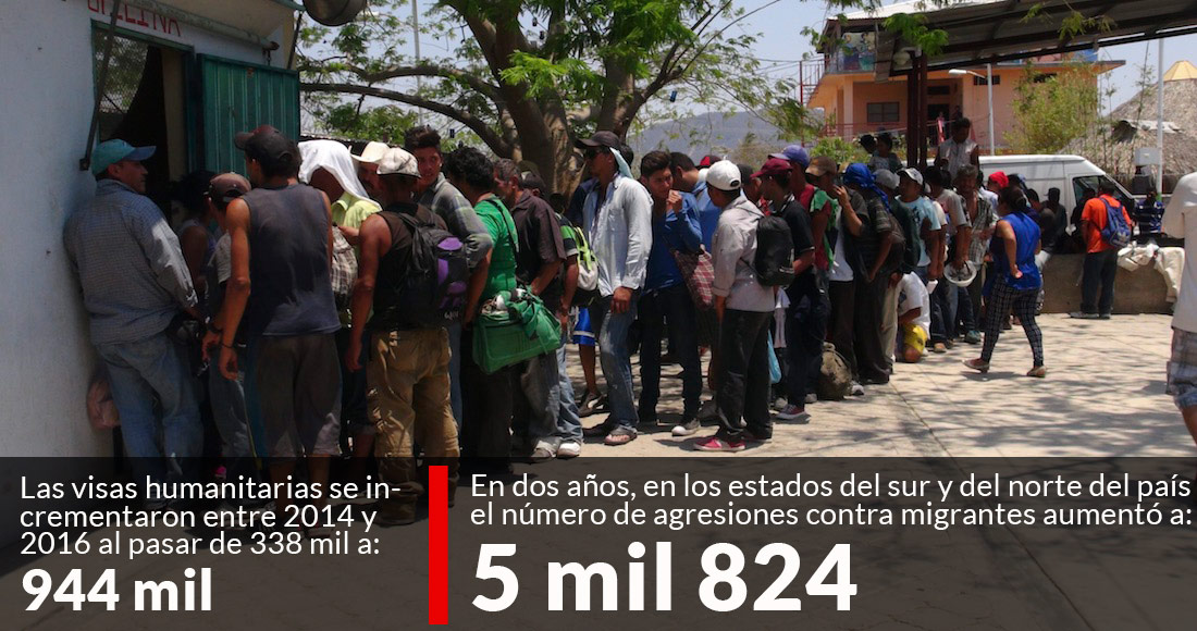 Entre 2014 y 2016, los secuestros, desapariciones y agresiones contra migrantes centroamericanos en México provocó que el número de visas humanitarias se incrementarán en un 575 por ciento, así lo reveló el informe “El acceso a la justicia para personas migrantes en México”, realizado por varias organizaciones, entre ellas, la Oficina en Washington para Asuntos Latinoamericanos (WOLA, por sus siglas en inglés), Fundar y la Casa del Migrante de Saltillo.