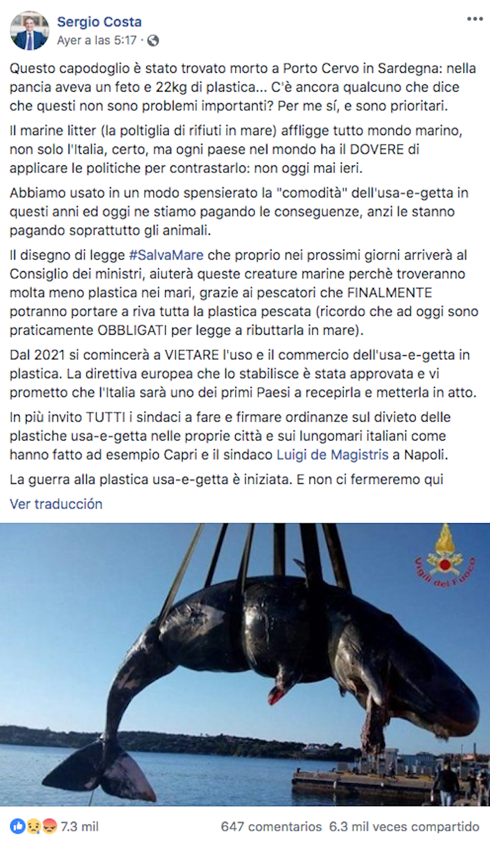 El Ministro de Medio Ambiente de Italia, Sergio Costa, lamentó la muerte de la ballena y dijo que planeaba proponer una nueva ley esta semana para limitar el uso de plásticos.