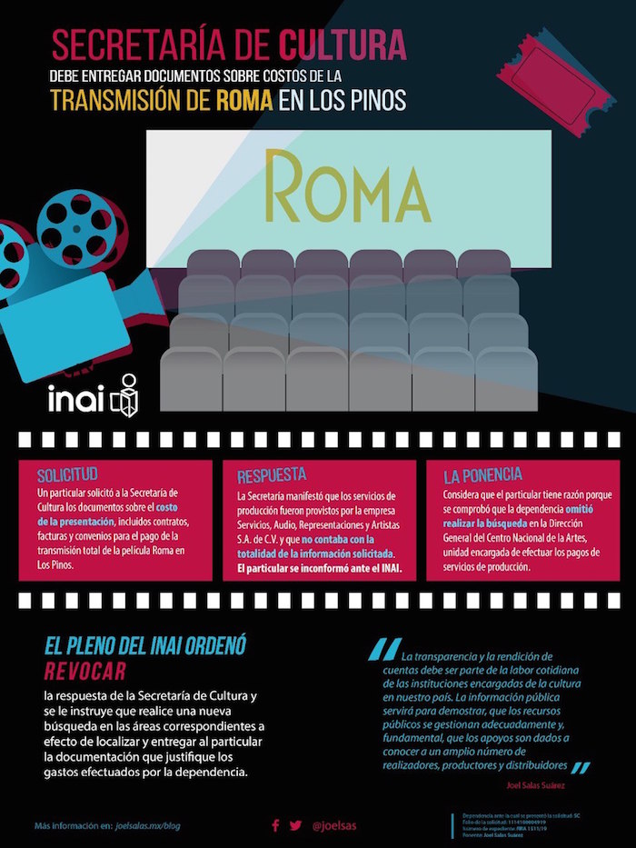 La dependencia informó en un comunicado que pidió a la Secretaría de Cultura transparentar todos los gastos que hizo al utilizar el complejo cultural de Los Pinos para la proyección cinematográfica de Roma, película del mexicano Alfonso Cuarón, luego de la demanda de información un ciudadano.