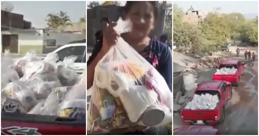 En una de las grabaciones se aprecia a al menos una decena de camionetas trasladar bolsas con productos de primera necesidad a habitantes de Tuxpan, Jalisco.