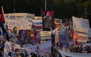 Banderas cubanas, miles de carteles con eslóganes de apoyo a la revolución o identificando los distintos centros de trabajo; fotos del expresidente Fidel Castro y hasta una figura gigante representando al coronavirus rodeado de las vacunas cubanas Abdala —una de las dos producidas por la isla— adornaron la manifestación para la cual muchos de los asistentes lucían sudaderas blancas, rojas o azules, los colores nacionales.