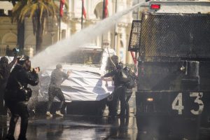 Manifestantes chocan hoy con Carabineros durante una marcha con motivo del Día Internacional del Trabajo, en Santiago, Chile. Foto: Diego Reyes Vielma, EFE