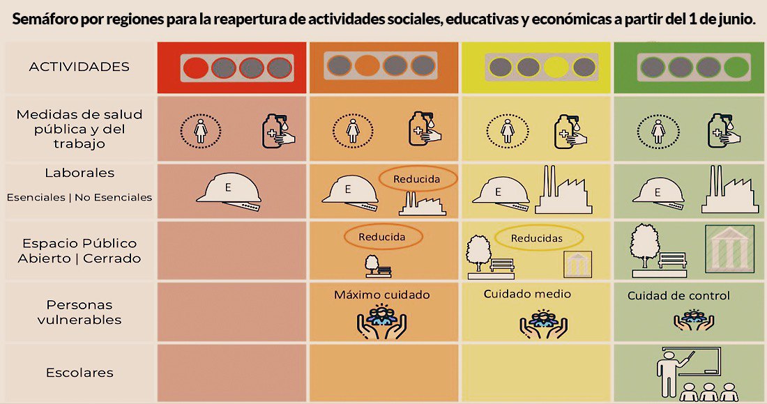 México está en emergencia todavía. Pero la Jornada Nacional de Sana Distancia termina con el país en rojo. ¿Por qué? Porque la apertura será focalizada, regionalizada. Y dependerá de cada zona pasar del rojo al naranja y del amarillo al verde. O al revés. Medidas de higiene permanentes, sana distancia, estornudo de etiqueta, protocolos en empresas aprobados por el IMSS, cubrebocas obligatorio en escuelas, transporte público y aeropuertos. La pandemia sigue, pero se busca reactivar la economía. El semáforo de riesgo de contagio se anunciará cada semana a los estados para determinar qué actividades se realizan, aunque al menos siete gobernadores se dicen en contra.