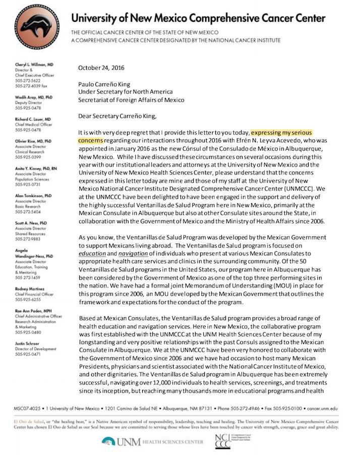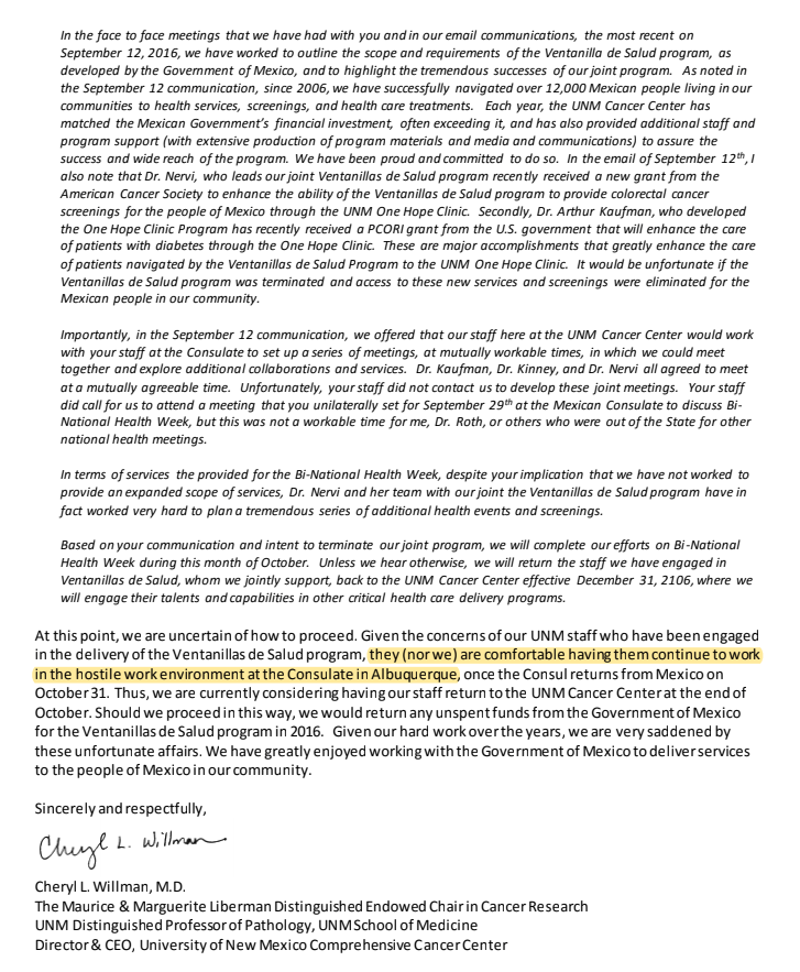 Pero no se detuvo con el personal del Consulado. En carta fechada 24 de octubre de 2016, dirigida a Paulo Carreño King, a la sazón subsecretario para América del Norte de la SRE, la doctora Cheryl L. Willman, directora y CEO del Centro Integral de Cáncer de la Universidad de Nuevo México (UNMCCC), denunció: