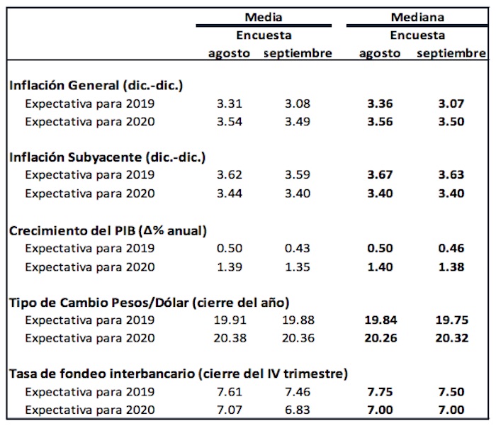 La encuesta fue recabada por el Banco de México entre 37 grupos de análisis y consultoría económica del sector privado nacional y extranjero. Las respuestas se recibieron entre los días 24 y 27 de septiembre.