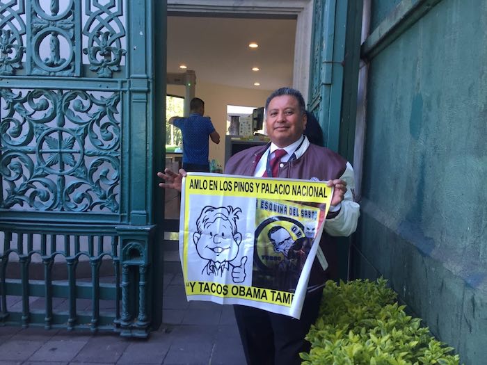 Un señor despliega una manta en la que está el famoso Obrador de caricatura y dice “se acabó la mafia, se acabó la mafia”.