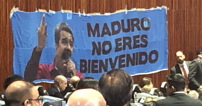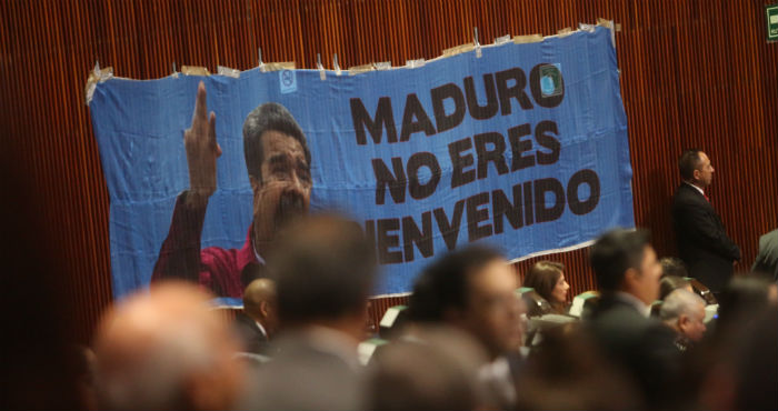 Pese a que Maduro no alcanzó a llegar al evento, el Grupo Parlamentario del blanquiazul también colocó una manta contra el venezolano, en la cual se leía la frase "Maduro, no eres bienvenido".