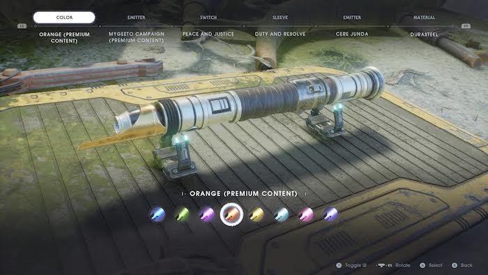 Por último, tenemos opciones de personalización tanto para nuestro personaje principal con el color de nuestro atuendo o de nuestro poncho, así como definir el color de nuestro droide BD-1 o el color de la nave donde viajamos, pero lo que más vas a disfrutar es modificar tu lightsaber, ya que podrás encontrar elementos en todos los planetas para cambiar su color, textura, material con el que esta hecho y hasta el tipo de empuñadura que tiene, redondeando de esta manera la experiencia de ser un Jedi.