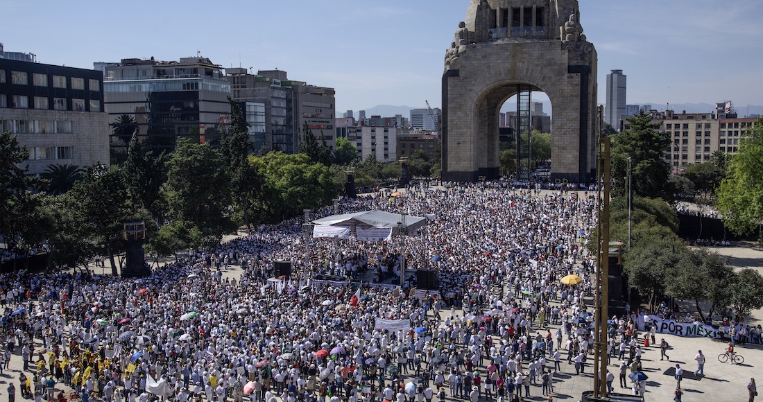 Vestidos de blanco, un grupo de ciudadanos que marchó del Ángel de la Independencia al Monumento a la Revolución contra el primer año de Gobierno del Presidente Andrés Manuel López Obrador gritaba “¡México!”, “fuera López”, “fuera Evo” y “LeBarón, no están solos”. Chalecos México, Observatorio Ciudadano, y otras organizaciones civiles acompañaron la movilización, además del PRD Estado de México y el PAN.