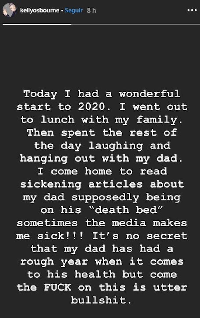 Ciudad de México, 2 de enero (SinEmbargo).– Luego de que un portal difundiera la noticia de que Ozzy Osbourne estuviera en su lecho de muerte, su hija, Kelly Osbourne, desmintió dicha afirmación.