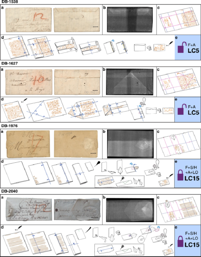 Los remitentes de estas cartas las cerraron mediante un proceso histórico por el que se dobla y asegura una hoja de papel plana para convertirla en su propio sobre, que durante siglos fue una práctica común para la comunicación segura.