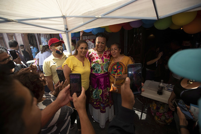 Marven, una mujer transgénero del estado de Oaxaca, posa para una foto con simpatizantes en un evento de campaña mientras se postula para un asiento en el Congreso de la Ciudad de México en un restaurante el sábado 29 de mayo de 2021. Foto: Fernando Llano, AP.