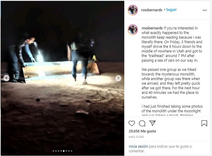 Ciudad de México, 2 de diciembre (RT).- El fotógrafo aficionado estadounidense Ross Bernards publicó en su cuenta de Instagram una serie de fotos que muestra qué pasó con el extraño monolito metálico, que fue descubierto el pasado 18 de noviembre en el desierto de Red Rock, en el estado de Utah, y desapareció 10 días después.