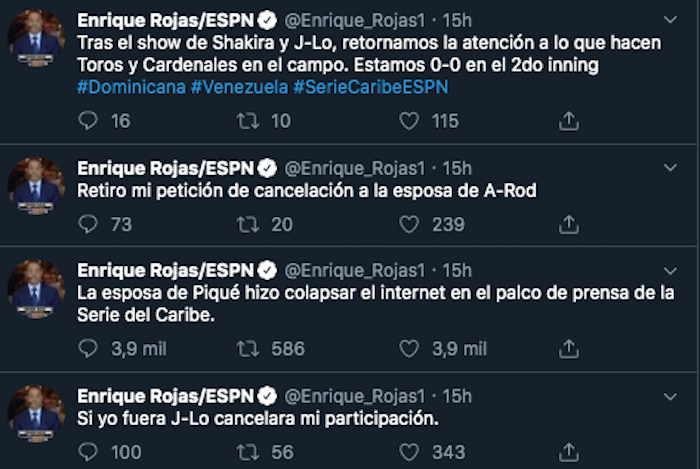 Ciudad de México,3 de febrero (SinEmbargo).- Enrique Rojas, comentarista de ESPN, escribió en su cuenta de Twitter un mensaje dirigido a Shakira por su presentación en el Super Bowl, sin embargo se refirió a la cantante como "la esposa de Piqué".