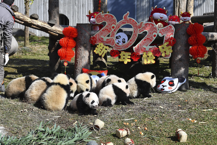 “Los pandas recién nacidos de 2020 (...) les desean un feliz Año Nuevo y muy buena suerte en el Año del Buey”, exclamaron los cuidadores con los oseznos en brazos, mientras algunos de los cachorros intentaban escabullirse.
