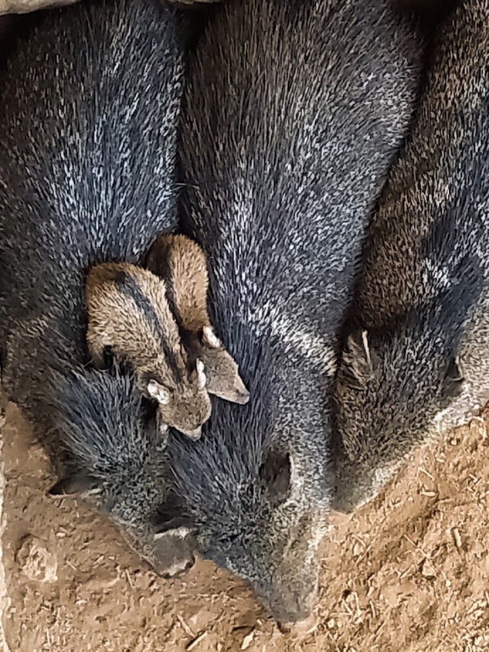 Por otro lado, la pecarí concibió a dos crías, que se encuentran en constante contacto con la madre y empiezan a socializar con otras hembras del grupo.
