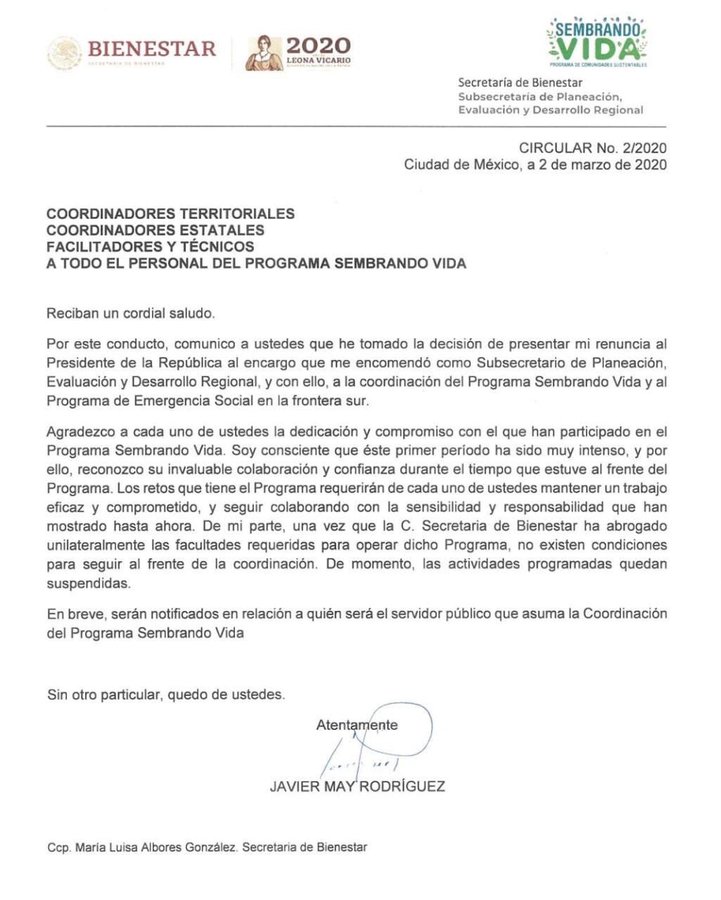 En una carta dirigida a los coordinadores territoriales y estatales, a los facilitadores técnicos y a todo el personal del programa "Sembrando Vida", May Rodríguez, político tabasqueño cercano al Presidente Andrés Manuel López Obrador, argumentó que la Secretaria de Bienestar, María Luisa Albores González “ha abrogado unilateralmente las facultades requeridas para operar dicho Programa”.