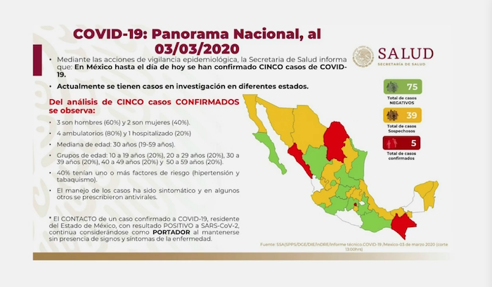 En conferencia de prensa precisaron que hasta el momento suman cinco casos confirmados de pacientes con el virus COVID-19, todos ellos fueron importados.