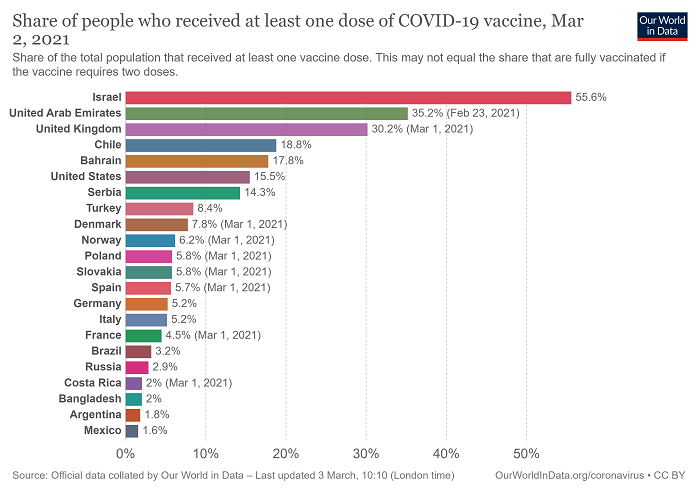 Según los datos de Our World in Data, hasta el 1 de marzo en esa nación del Cono Sur ya se le había suministrado al menos una dosis al 18 por ciento de su población total, una cifra que sólo es superada por el Reino Unido (29.9 por ciento), Emiratos Árabes Unidos (35.2 por ciento) e Israel (55.1 por ciento). En Latinoamérica, el segundo país con mayor tasa de vacunación es Brasil, pero con un índice muy inferior: 3.1 por ciento. Por detrás aparecen Costa Rica (2 por ciento), Argentina (1.7 por ciento) y México (1.5 por ciento), mientras que el resto de los Estados regionales ni siquiera supera el 1 por ciento.