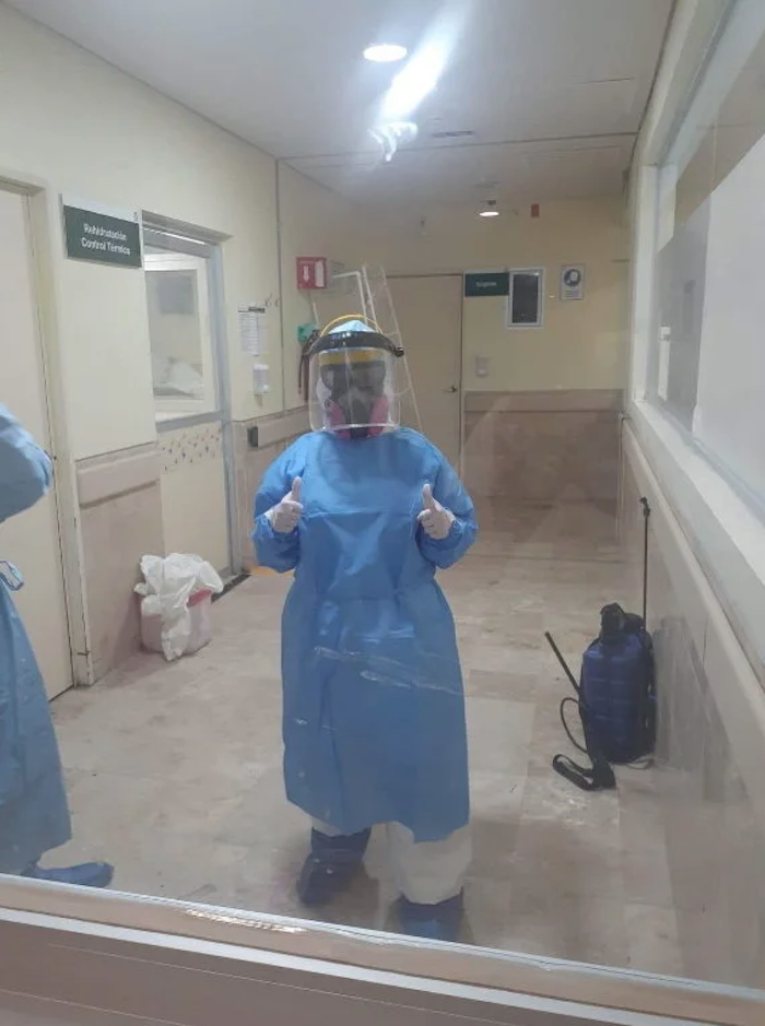 Cuando sale del área se baña, se desinfecta. Una persona de limpieza entra a desinfectar el área. Se tiene que cambiar de ropa y usar un uniforme nuevo y seguir la rutina. El turno nocturno, que a veces le toca, es de 11 horas; 11 horas en los que tiene que usar el equipo completo, no puede ir al baño, no puede comer, no puede tomar agua.