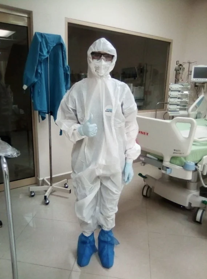 Si le avisan que hay un paciente con una patología respiratoria se tiene que preparar, usar botas, doble guante, usar el cubrebocas N95, usar goggles. “Te transformas y entras al área de enfermedades respiratorias que está aparte y te quedas vestido hasta que termines, hasta que el paciente se haya dado de alta u hospitalizado. No te puedes cambiar. Pueden pasar muchas horas”, relata.