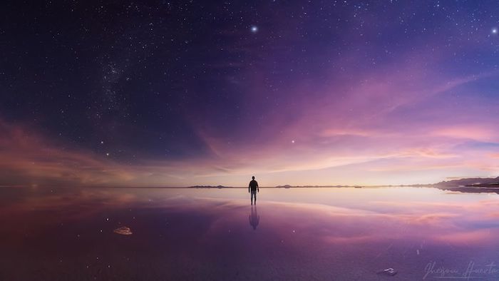 "Primero realicé la foto del cielo. Hice siete fotografías para abarcar todo el ángulo de la Vía Láctea, una fila de siete imágenes verticales del cielo. Luego incliné la cámara hacia el suelo para hacer otras siete fotografías más del reflejo. Dos filas de siete serían 14 imágenes. Y para la última regresé lo que es el ángulo de la cámara al medio de la Vía Láctea, corrí por unos 15 metros y con un control remoto inalámbrico disparé a la distancia", afirmó.