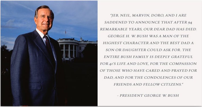 El patriarca de la familia Bush fue piloto de guerra durante la Segunda Guerra Mundial, congresista, embajador en la ONU, director de la CIA, Vicepresidente en la Administración de Ronald Reagan entre 1981 y 1989 y puso fin a sus cuatro décadas de carrera política como Presidente (1989-1993), desde donde lideró el fin de la Guerra Fría.