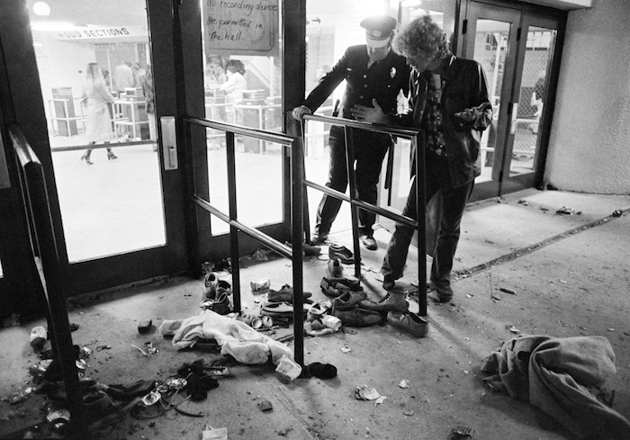 Fotografía del 3 de diciembre de 1979 un guardia de seguridad y un hombre no identificado revisan la zona donde varias personas murieron aplastadas durante una estampida en el riverfront coliseum de Cincinnati durante un concierto de la banda de rock británica The Who. Foto: AP/Brian Horton