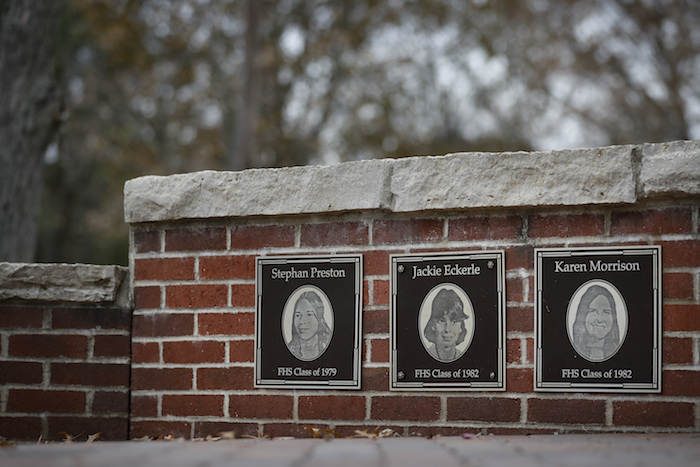 Los rostros de tres estudiantes de Finneytown que murieron en una estampida en el concierto de The Who en un monumento memorial. Foto: AP/John Minchillo