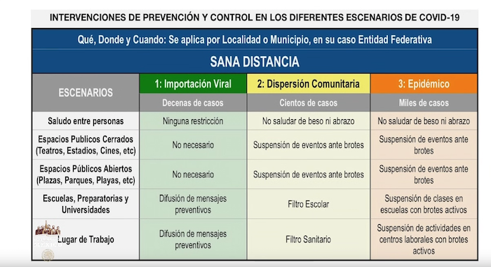 La Secretaría de Salud explicó en conferencia de prensa que las intervenciones de prevención y control en los diferentes escenarios del COVID-19 se dividen según los escenario de importación viral, donde se registran decenas de casos; el de dispersión comunitaria, con cientos de casos: y el escenario epidémico, donde habría miles de casos.