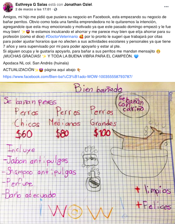 “Amigos, mi hijo me pidió que pusiera su negocio en Facebook, esta empezando su negocio de bañar perritos. Obvio como toda una familia emprendedora no le quitaremos la intención, agregandole que esta muy emocionado y motivado ya que este pasado domingo empezó y le fue muy bien!”, escribió la mujer en Facebook.