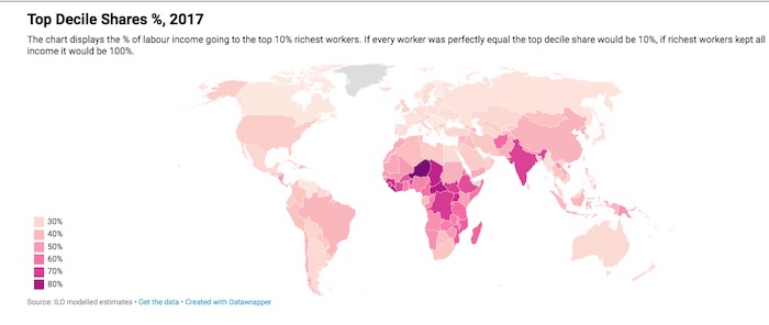 El mapa muestra la proporción de ingresos laborales que obtuvo el 10 por ciento con más ingresos en 2017. Foto: OIT.