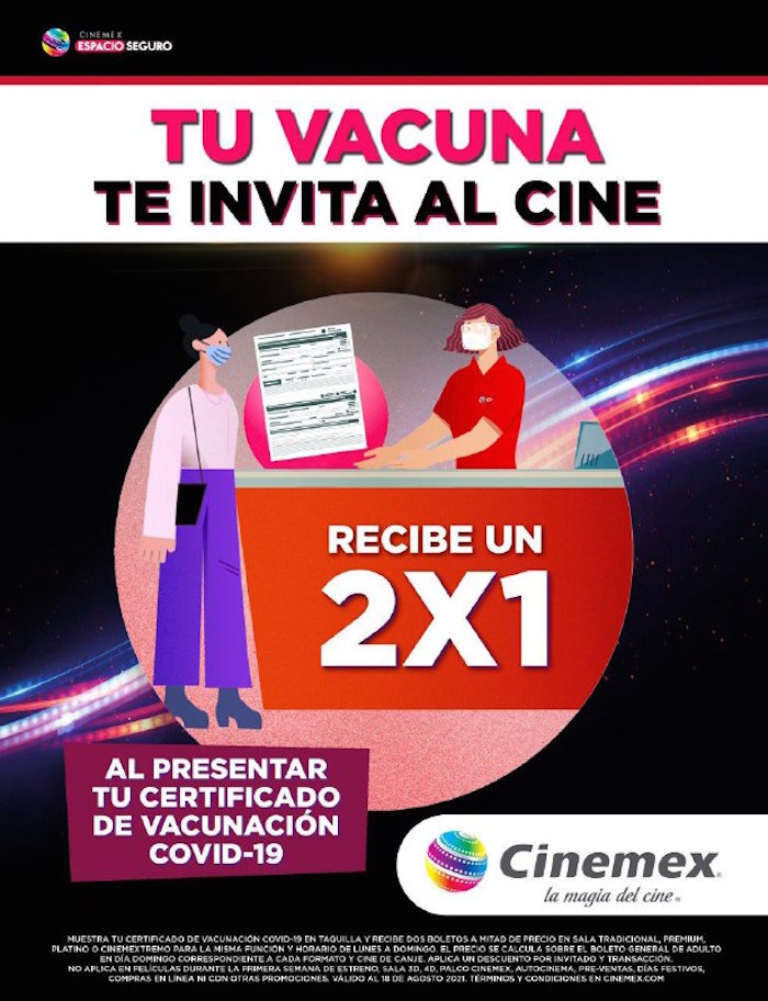 La cadena de cines en México promueve la vacunación contra la COVID-19 y efrecerá entradas al 2x1. La promoción será válida a partir del 5 de agosto en todos los complejos Cinemex del país.