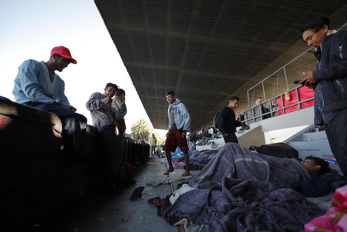 En la parte exterior del estadio se ha instalado otra carpa en la que decenas de migrantes descansan entre cobijas y mochilas.