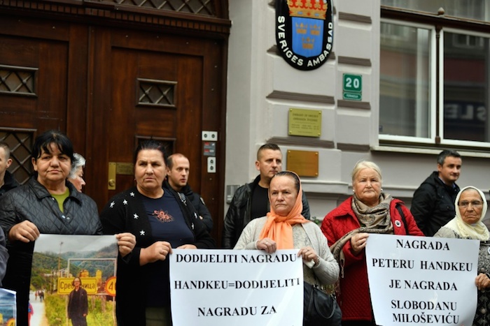 Las mujeres bosnias musulmanas cuyos esposos e hijos fueron asesinados en Srebrenica se unieron a la protesta, a la que llevaron una fotografía de Handke con el texto: “Premiar a Handke equivale a premiar crímenes de guerra”.