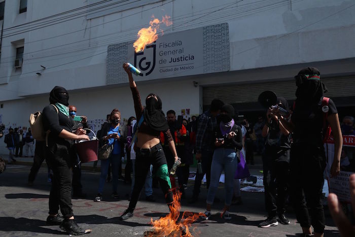 Por esto, el grupo prendió una pequeña fogata frente al edificio y emitió consignas y cánticos reclamando justicia por Pamela, por las mujeres desaparecidas en el país y por las más de diez asesinadas en México cada día.