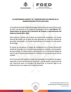 La autoridad de Durango informó también que el exfuncionario ya fue trasladado a la capital de Durango e ingresado a las instalaciones del Centro de Reinserción Social (Cereso) número 1 de esta ciudad capital, en donde el Juez determinará su situación penal y quedará a la espera de la audiencia inicial.